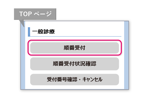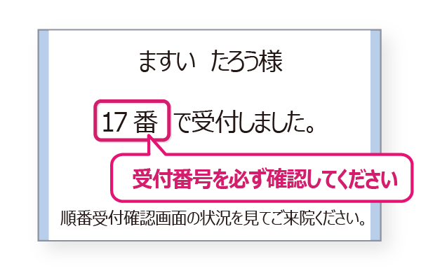 TOPページの[受付番号確認・キャンセル]ボタンをクリックして、診察券番号(仮番号)+誕生日(4ケタ)を入力で、現在の予約状況が確認できます。