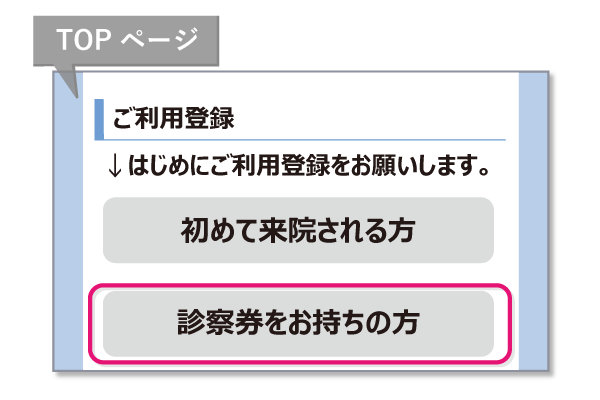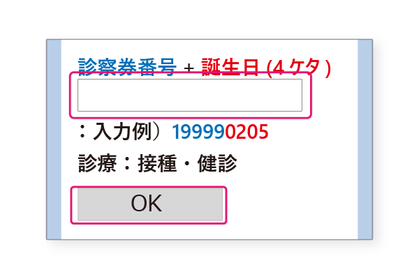 予約したい方の診察券番号(仮番号)+誕生日(4ケタ)を入力してください。